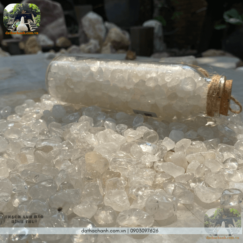– Đá thạch anh trắng vụn mài nhẵn: Kích thước lý tưởng khoảng 1-1.5cm. Đá phải là đá thạch anh trắng tự nhiên (Quartz) để đảm bảo mật độ năng lượng.