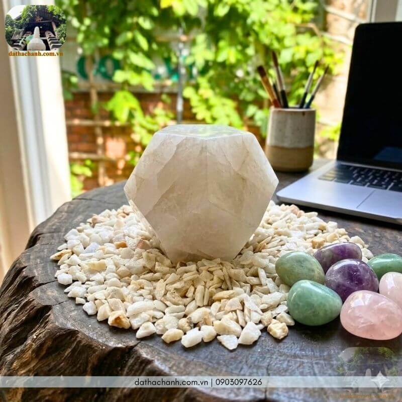 – Góc làm việc “chữa lành”: Đặt quả cầu 12 mặt trên một đế gỗ mộc tự nhiên, xung quanh rải thêm một lớp thạch anh vụn thô hoặc đá vụn bóng. Sự kết hợp giữa đá đã qua chế tác và đá thô tạo nên sự cân bằng, giúp giảm bức xạ máy tính và tăng khả năng sáng tạo.