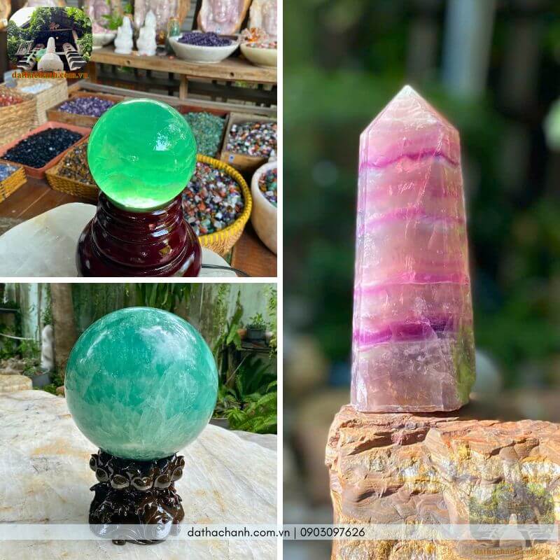 – Vật phẩm để bàn: Quả cầu đá Fluorit xanh hoặc trụ đá Fluorit là lựa chọn hàng đầu cho bàn làm việc.
