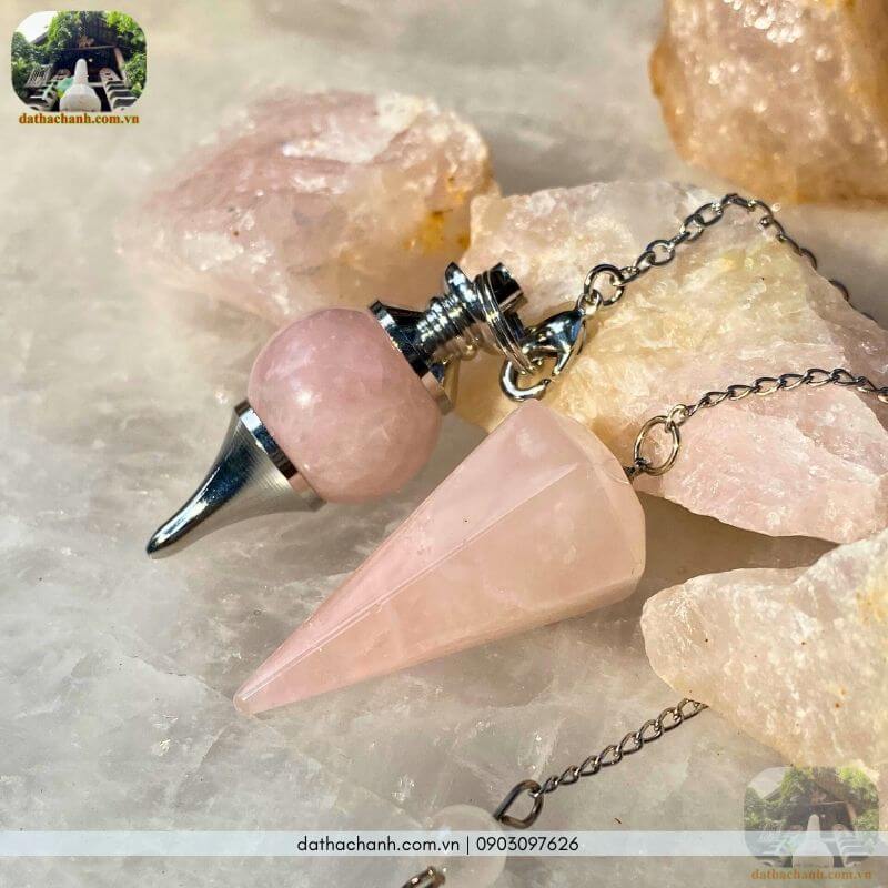 – Con lắc thạch anh hồng: Chứa năng lượng yêu thương và chữa lành. Rất nhạy bén khi bạn cần dùng con lắc để đo lường năng lượng của các mối quan hệ, hàn gắn cảm xúc, hoặc kiểm tra sự hòa hợp phong thủy trong phòng ngủ.