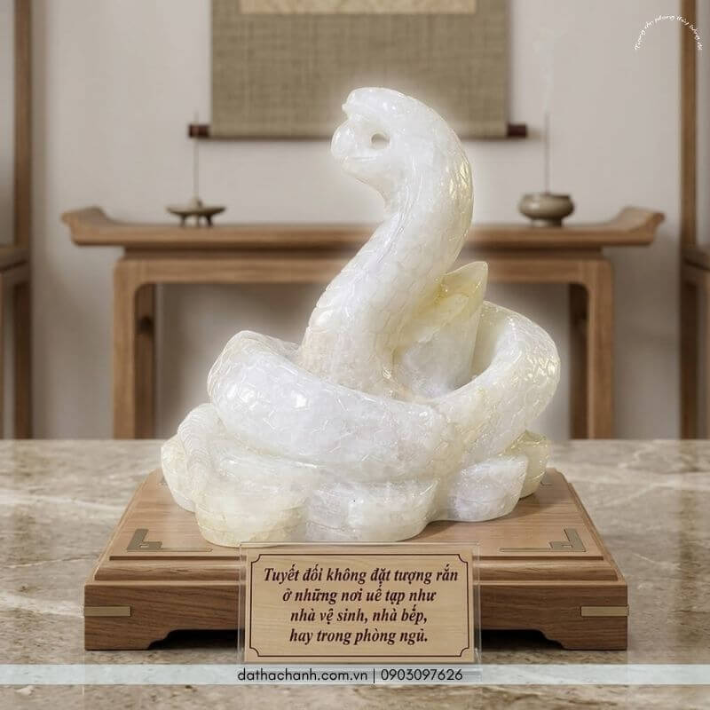 – Lưu ý đại kỵ: Tuyệt đối không đặt tượng rắn ở những nơi uế tạp như nhà vệ sinh, nhà bếp, hay trong phòng ngủ (vì rắn mang năng lượng mạnh, có thể gây khó ngủ hoặc bất an).