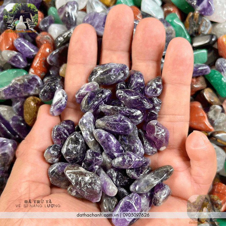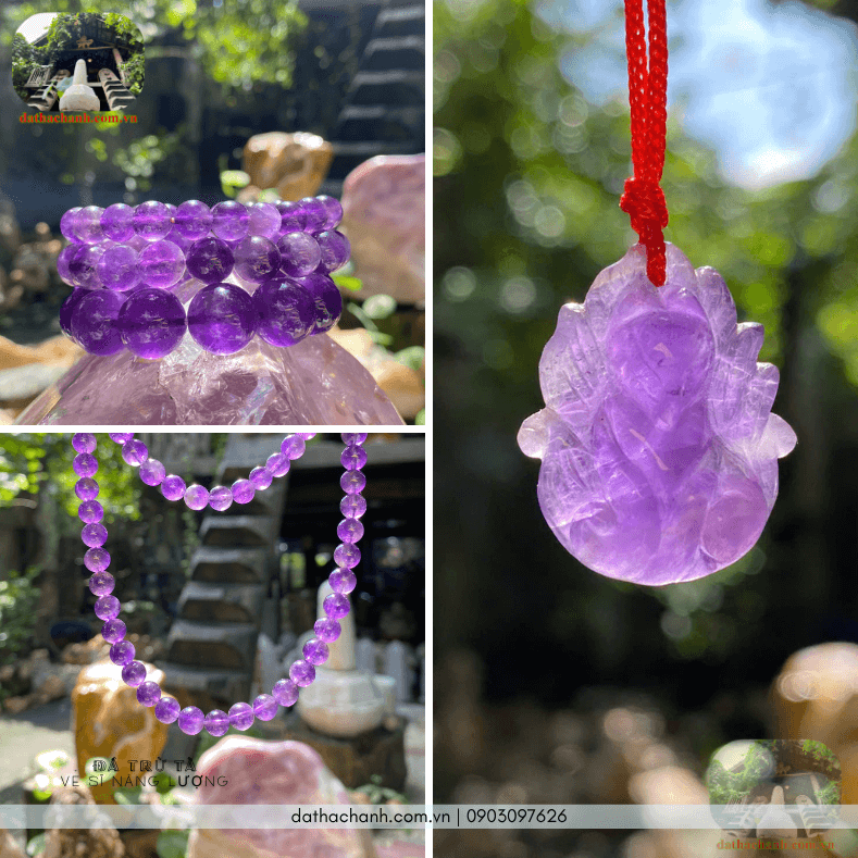 – Thạch anh tím (Amethyst): Xua tan ám khí, bảo vệ chủ nhân khỏi tiêu cực, giúp an tâm và khai sáng trí tuệ.