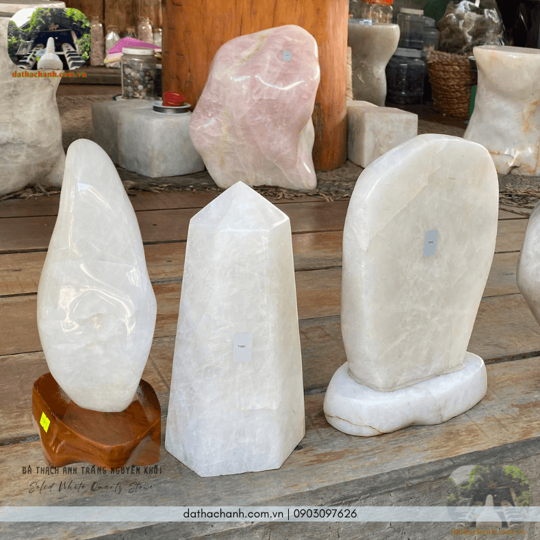 – Đá thạch anh trắng nguyên khối đánh bóng: Có giá từ 550.000đ/kg đến 1.000.000đ/kg (hoặc cao hơn). Giá bán tùy thuộc vào độ đẹp (trắng tinh hay có phèn), màu sắc (trong trong, trắng đục, trắng sữa), kiểu dáng trụ và kích thước.