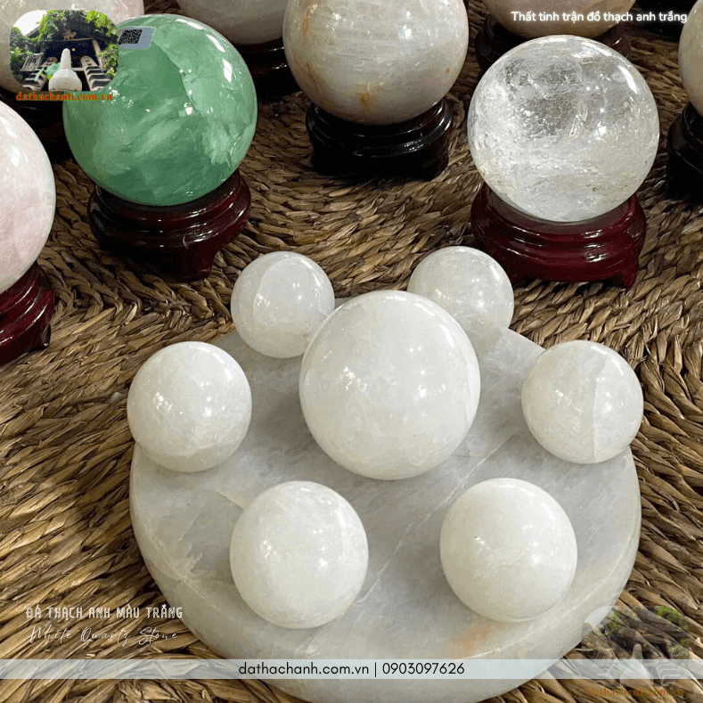 Bộ trận pháp gồm 7 viên bi đá, tạo ra nguồn năng lượng hài hòa và mạnh mẽ. Trận đồ đá thạch anh màu trắng giúp kích hoạt may mắn toàn diện, bảo vệ và thanh lọc năng lượng cho ngôi nhà, cơ quan.