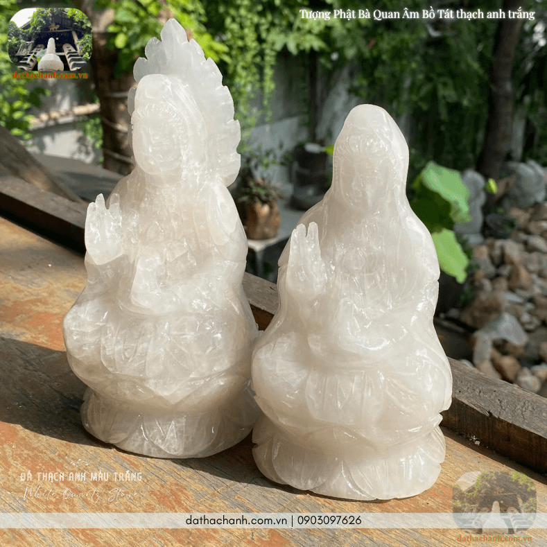 Tượng Phật Bà Quan Âm Bồ Tát đá thạch anh màu trắng tượng trưng cho lòng từ bi, cứu khổ cứu nạn. Tượng Phật Bà bằng đá thạch anh màu trắng mang lại sự bình an tuyệt đối, che chở, hóa giải tai ương, giúp tâm hồn thanh tịnh và hướng thiện.