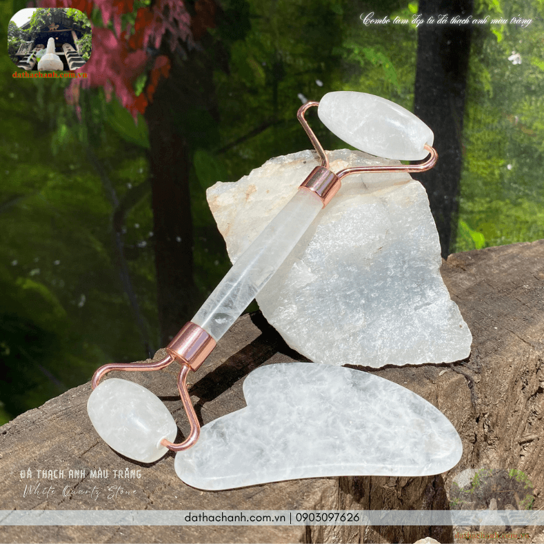 Bộ đôi thanh lăn và miếng Gua Sha đá thạch anh màu trắng mang đến trải nghiệm chăm sóc da tinh khiết. Thạch anh trắng giúp làm dịu da, giảm sưng tấy và kích thích lưu thông máu. Sử dụng hàng ngày giúp nâng cơ mặt tự nhiên, giảm nếp nhăn và giúp tinh chất thẩm thấu tối ưu. Thanh lọc năng lượng, cho làn da rạng ngời, tươi trẻ.