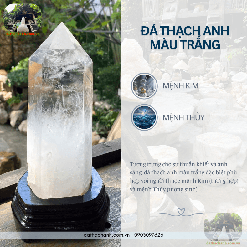 – Hợp mệnh: Tượng trưng cho sự thuần khiết và ánh sáng, đá thạch anh màu trắng đặc biệt phù hợp với người thuộc mệnh Kim (tương hợp) và mệnh Thủy (tương sinh).